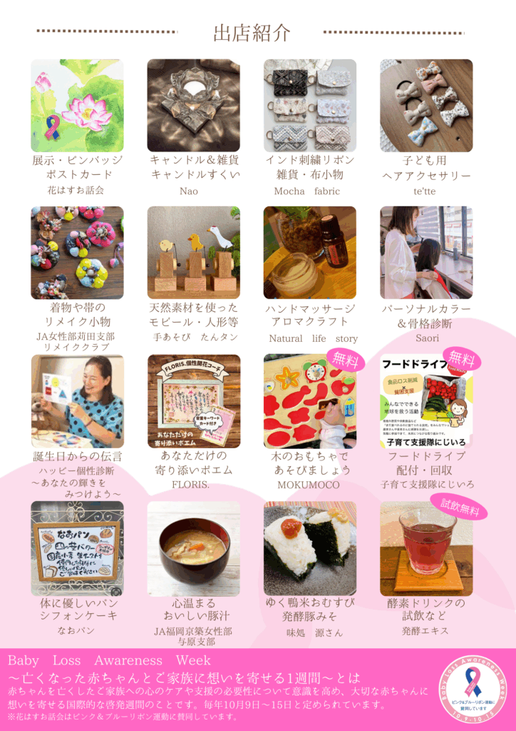 ・流産や死産などの経験をしたママや応援者によるマルシェ(販売、ワークショップ、体験など)